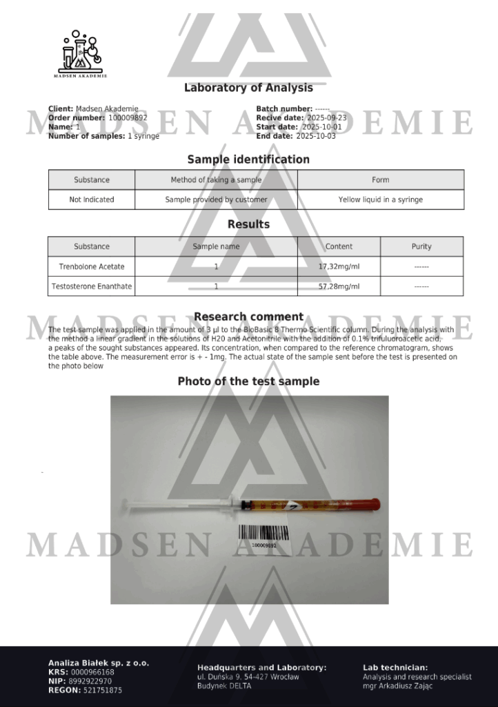 gemessen: Tren A 17 mg/ml, Test E 57 mg/ml (statt Tren E 100 mg/ml)
